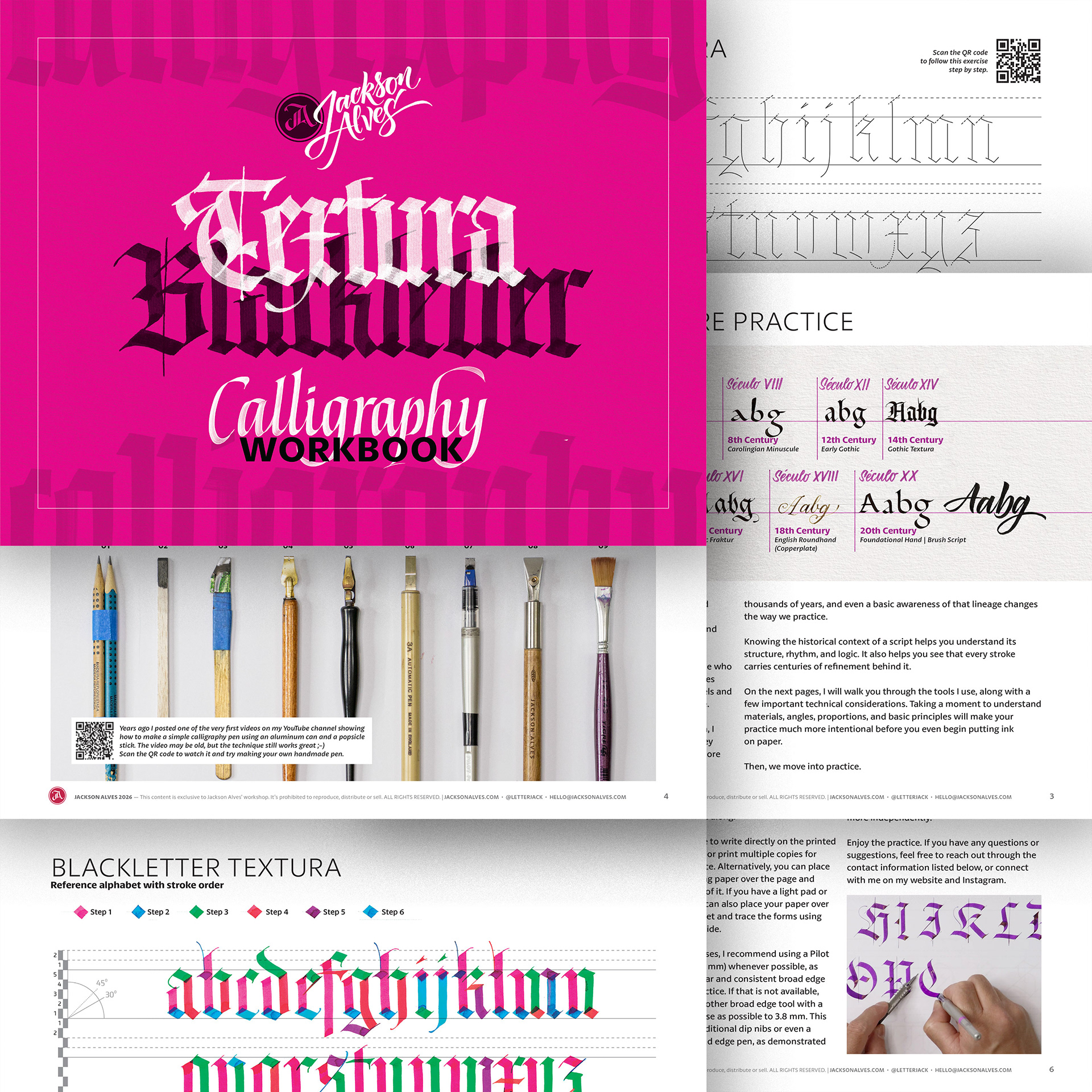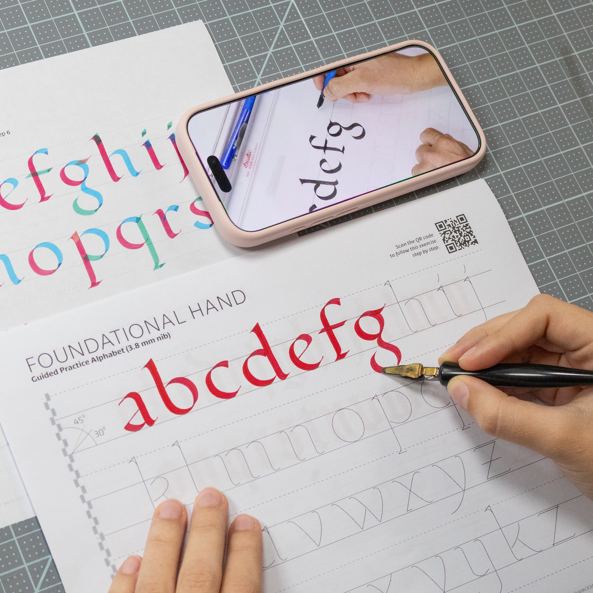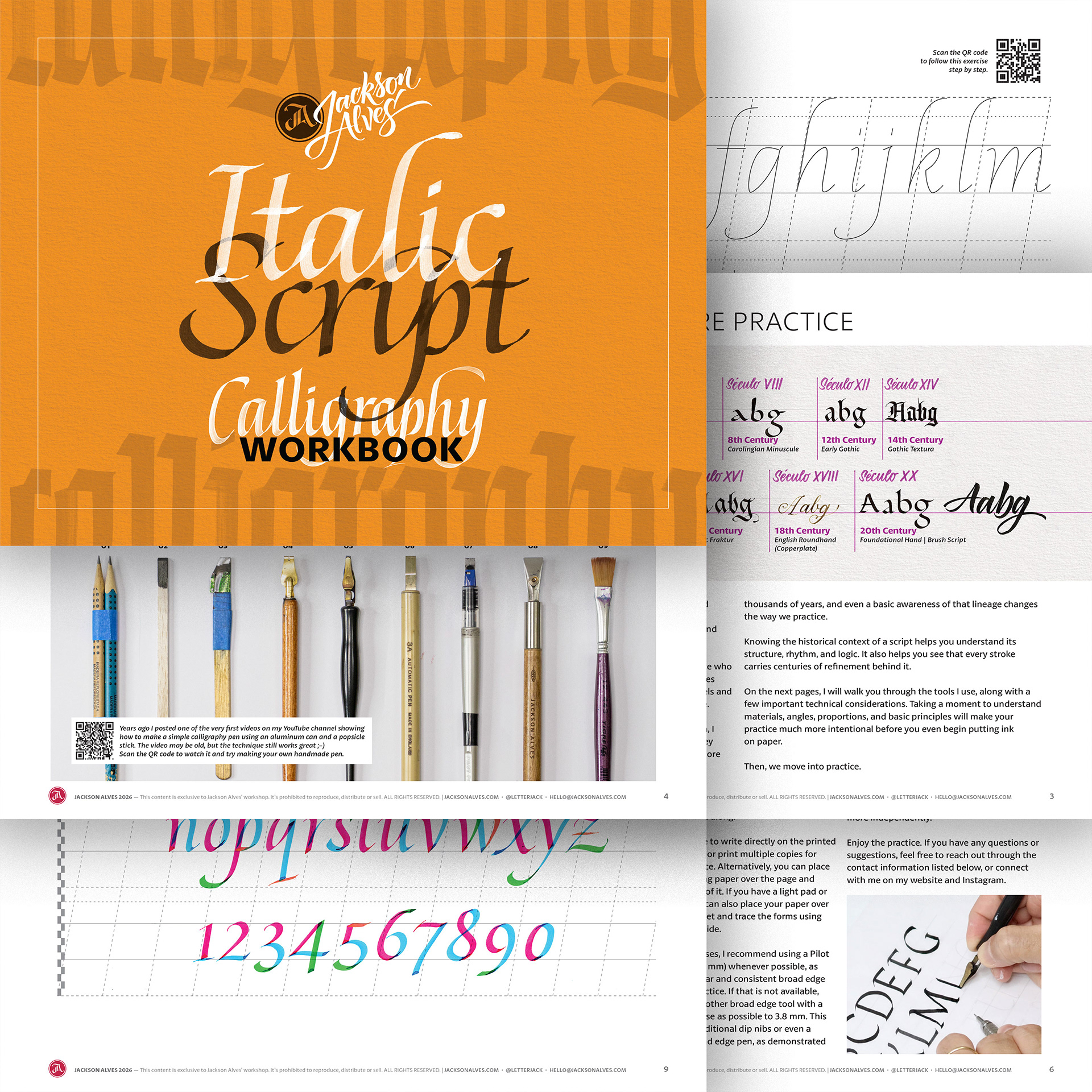Each workbook is designed to help you understand and practice a specific script through a clear, structured, and practical approach. The focus is on hands-on practice, supported by a short introduction, tool guidance, and guided exercises. You can also scan the QR code to follow the full process in real time, watching each letter being built step by step as you practice.