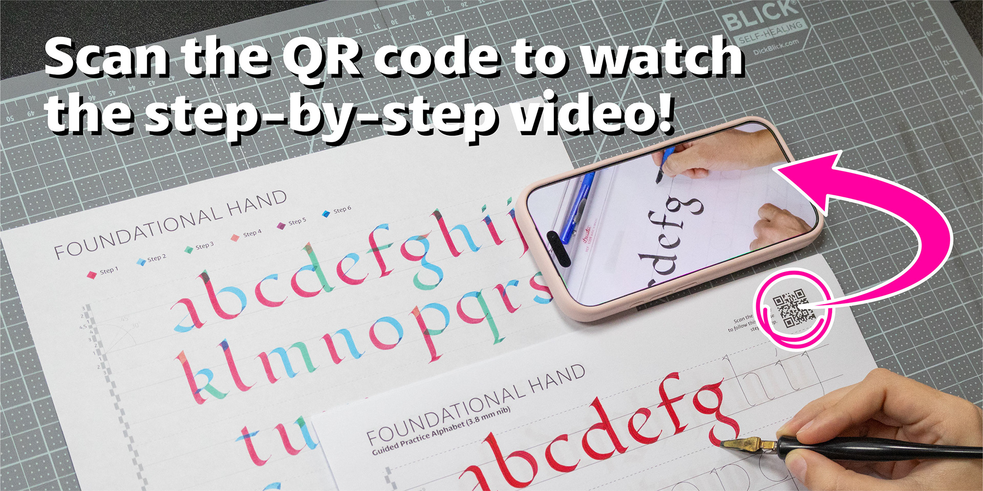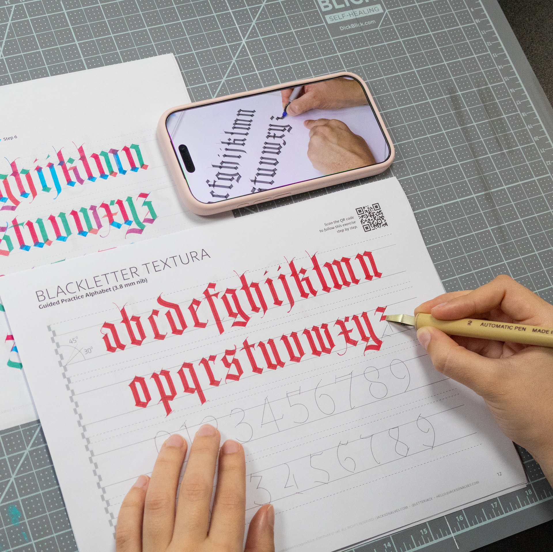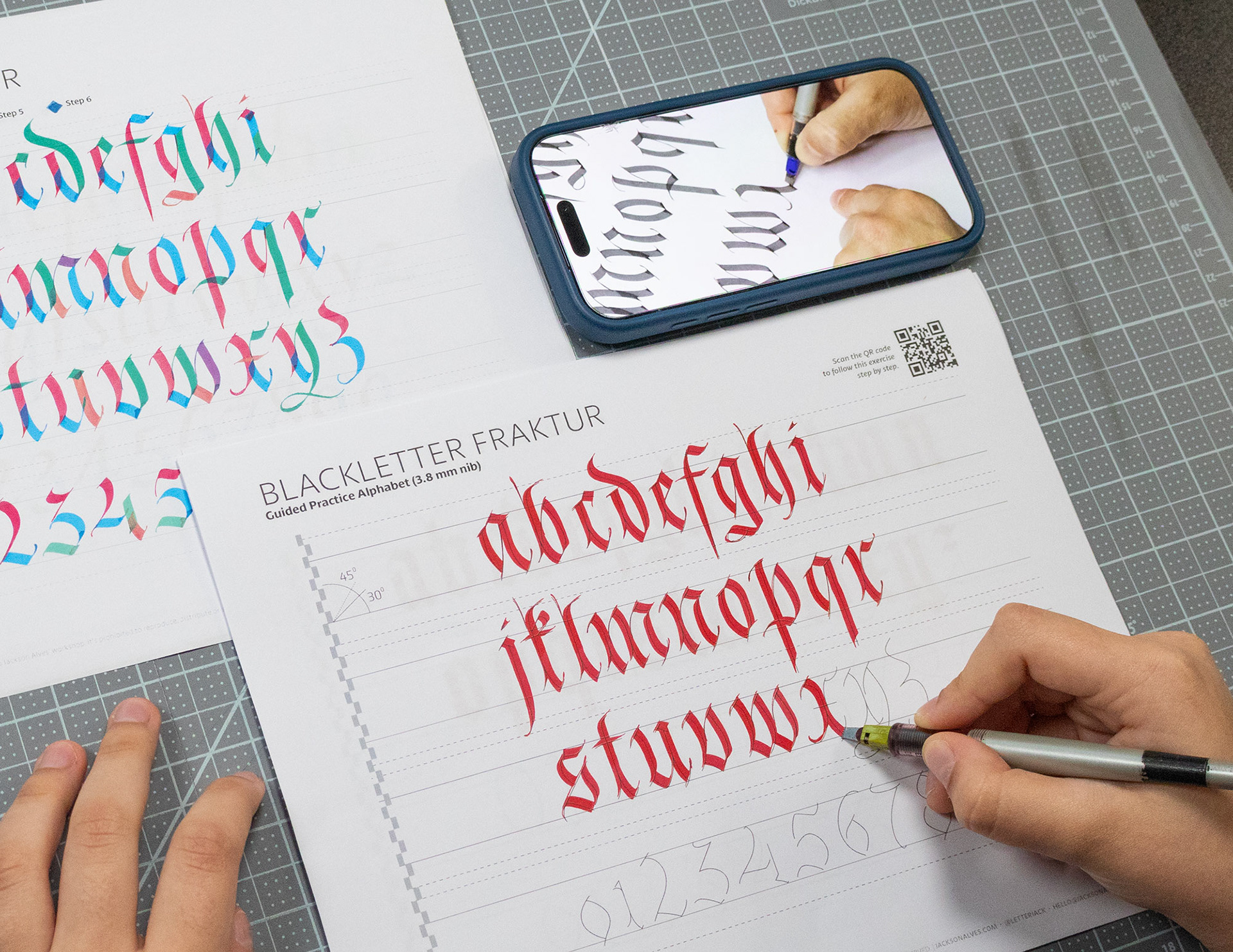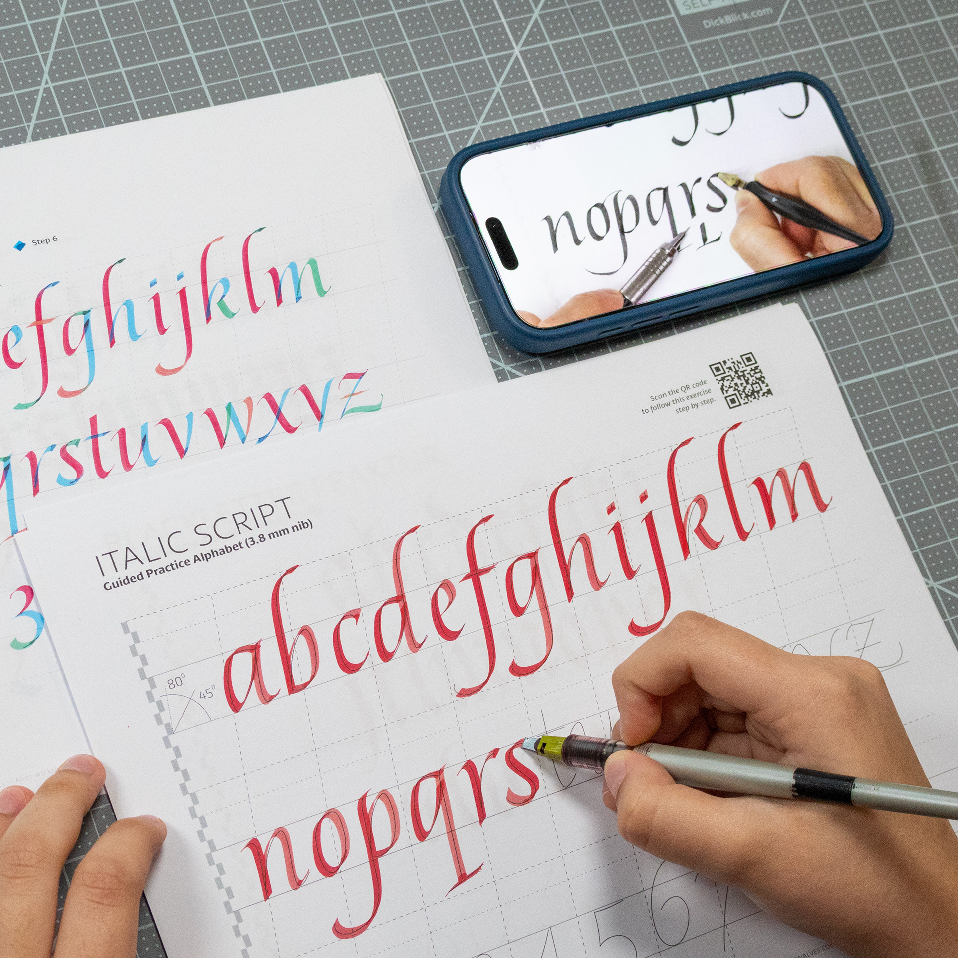 Each workbook is designed to help you understand and practice a specific script through a clear, structured, and practical approach. The focus is on hands-on practice, supported by a short introduction, tool guidance, and guided exercises. You can also scan the QR code to follow the full process in real time, watching each letter being built step by step as you practice.
